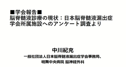1)脳脊髄液診療の現状:日本脳脊髄液漏出症学会所属施設へのアンケート調査より 中川紀充 明舞中央病院 脳神経外科